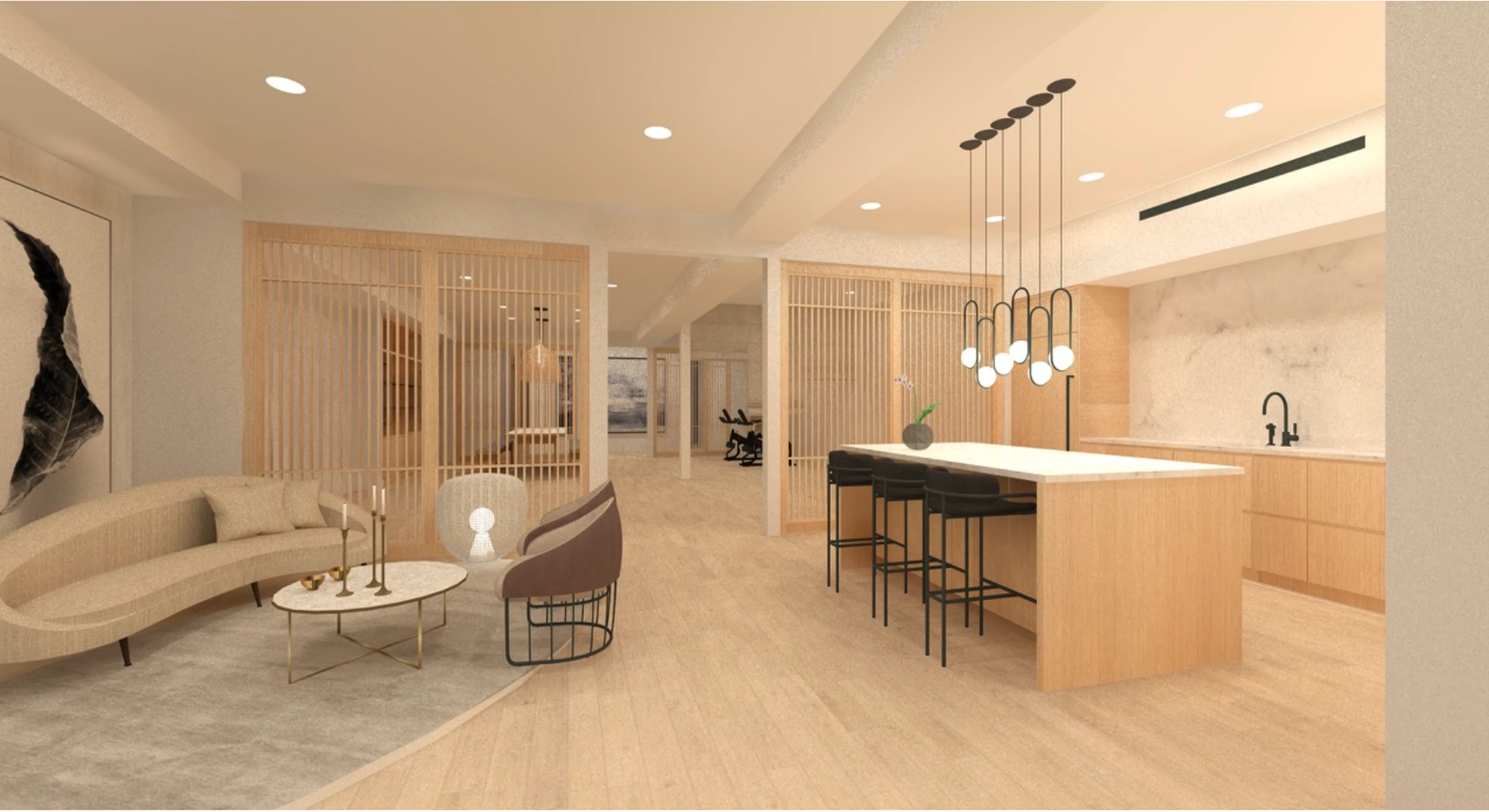 Workout equipment and a sauna were integrated with soft seating and calming decor, creating a space that is equally inviting and utilitarian.